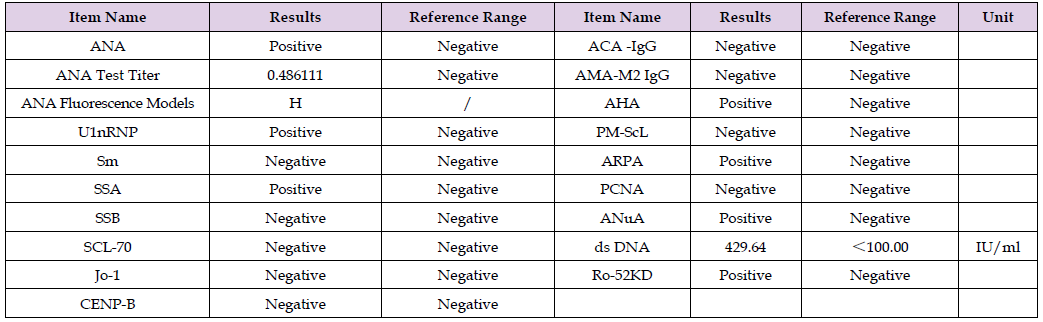 Note: ANA, anti-nuclear antibody; H, Homogeneous; U1nRNP, anti-nuclear ribonucleoprotein U1 small nuclear ribonucleoprotein antibody; Sm, anti- Smith antibody; SCL-70, anti-scleroderma 70 antibody; Jo-1, anti-Jo-1 antibody; CENP-B, anti-centromere protein-B antibody; ACA, anti-cardiolipin antibody; AMA-M2, Anti-mitochondrial antibody M2 subtype; AHA, anti-histone antibody; PM-ScL, anti-PM-Scl antibody; ARPA, anti-ribosomal P protein antibody; PCNA, anti-proliferating cell nuclear antigen antibody; ANuA, anti-nucleosome antibody; ds DNA, anti-double-stranded DNA antibody; Ro-52KD, anti-ribonucleoprotein antigen 52 kDa antibody.