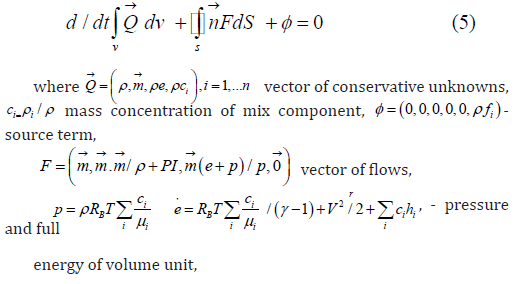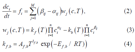 where M, n–number of reactions and components of the mix, αij , βij - coefficients of direct and inverse reactions. Arrhenius low is predicted for calculating of speeds of changing of mix components concentration ci