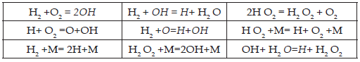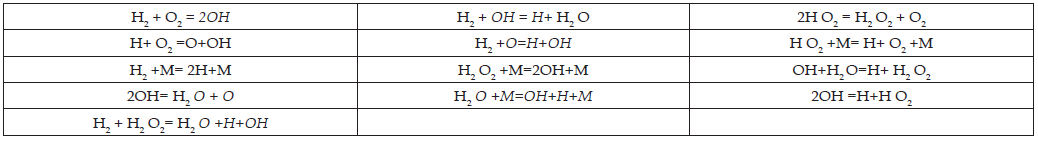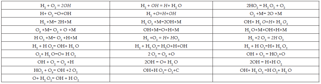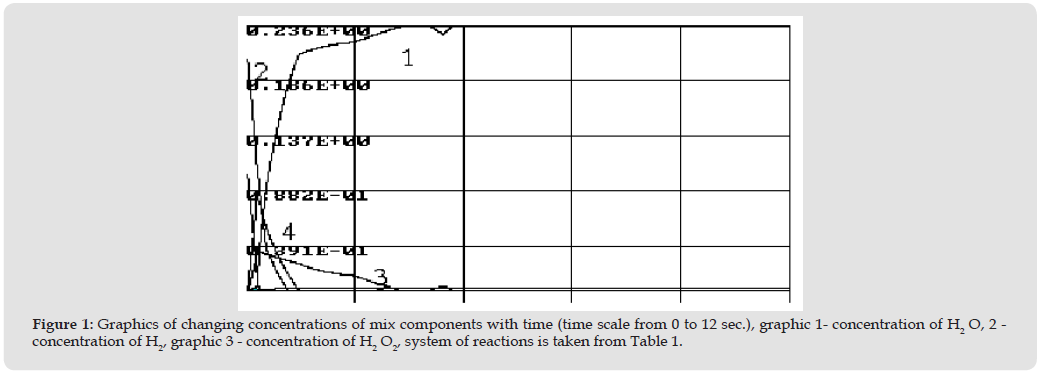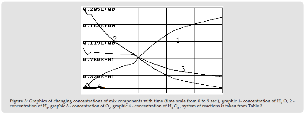 The algorithms for numerical solving of system [2-4] consist of solving fool system of stiff ODE (ordinary differential equations) on the basis of numerical Gear method. Different authors [4-7] used different systems of reactions for numerical simulation of hydrogen-air mixes deflagration. In this paper we try to compare results of using some of these systems. The first system of reaction for hydrogen-air gas mix of 9 component: Н2, О2, Н, О, Н2О, ОН, НО2, Н2О2, N2 is the most widespread. The next 9 reactions where choose: Results of numerical decision (for small closed finite volume without gas dynamics effects) of stiff ODE system [2-4] on the basis of Gear method with system of reaction from Table 1 are shown on the Figure 1. Initial meanings of components H2 =0.2 of molar amounts of mix, O2 =0.1 of molar amounts of mix, N2 =0.7 of molar amounts of mix, initial concentration of H2 O =0., final meanings of H2 O 0,2 of molar amounts of mix. During the calculation time changes from 0 to 12 sec. Calculation began with temperature T=3.3Tatm, and it changes during calculation in connection with heat effect of chemical reactions. From this example and the next ones can be seen that appearance of significant amount of radical H2 O2 in gas mix lead to fast speed of changing for main components (H2, O2 and H2 O), that demonstrate deflagration initiation. The second system of reactions (situated in Table 2) was system of 13 reactions for the same components Н2, О2, Н, О, Н2О, ОН, Н О2, Н2О2, N2: Results of numerical decision of stiff ODE system [2-4] on the basis of Gear method with system of reaction from Table 2 are shown on the Figure 2. Initial meanings of components H2 =0.2 of molar amounts of mix, O2 =0.1 of molar amounts of mix, N2 =0.7 of molar amounts of mix, initial concentration of H2 O =0., final meanings of H2 O 0,2 of molar amounts of mix. During the calculation time change from 0 to 9 sec. Calculation began with initial temperature T=3.25Tatm. The third system of reactions (situated in Table 3) was system of 28 reactions-with one additional component O3: Results of numerical decision of stiff system of ODE [2-4] on the basis of Gear method with system of reaction from Table 3 are shown on the Figure 3. Initial meanings of components H2 =0.2 of molar amounts of mix, O2 =0.1 of molar amounts of mix, N2 =0.7 of molar amounts of mix, initial concentration of H2 O =0., final meanings of H2 O 0,2 of molar amounts of mix. During the calculation time change from 0 to 9 sec. Calculation began with temperature T=3.1Tatm, and it changes during calculation in connection with heat effect of chemical reactions.