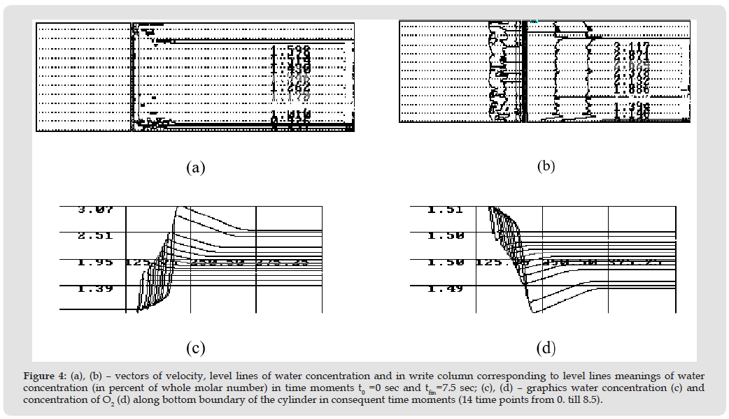 In this paragraph we compare using of systems of reactions from Table 2 and Table 3 for numerical simulation of deflagration appearance in hydrogen – air gas mixtures flows. Numerical simulations of deflagration appearance in hydrogen – air gas mixtures flows with using system of reactions from Table 1 can be found in, for example, in [4-7] and previous papers of author [9]. The system of the equations of ideal gas and the kinetic equations in the integral form for two dimensional flows with source term which are velocities of changing gas mix components (2) can be presented as follows: