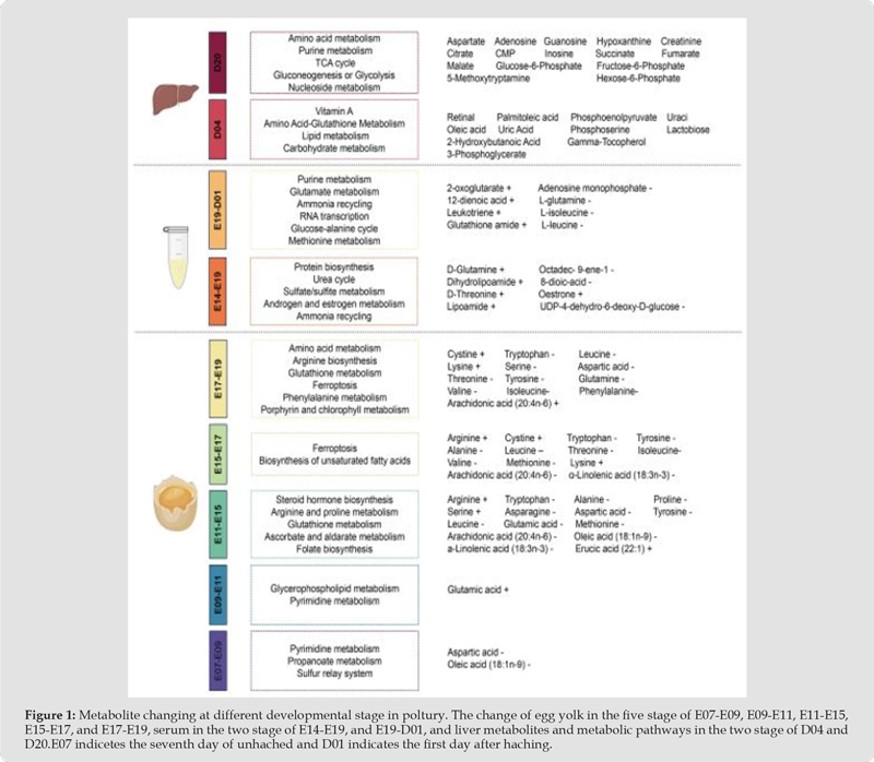 Certain tiny molecular metabolites can be examined and chosen as biomarkers for various poultry breeds and developmental stages by detecting them in serum, egg yolk, liver, and other tissues. Figure 1 illustrates the alterations in tissue metabolites and metabolic pathways at various growth phases. The developing breeding chicken embryo spends about 30% of its life cycle inside the hatching egg, which is a complicated structure. The nutrients in the hatching egg, which serve as the early embryo’s primary food source, are essential for the growth and development of chicks as well as for enhancing immunological function. Throughout the embryo’s development, the yolk portion of the hatching egg structure is thought to be the primary source of nutrients. (Zhang et al., 2024). A common and reasonably priced source of protein for human diets is the domestic chicken. The chicken has a long history of being a useful model organism for study in addition to being a food animal. Chicken was chosen as the first agricultural animal model to undergo genome-level sequencing due to these two factors. A variety of characteristics make chickens a good model for research on adipose biology, obesity, and insulin resistance, even though they have been extensively utilized in studies of immunology and developmental biology. In comparison to slimmer egg-laying or wild strains of chickens, commercial broiler chickens in particular quickly build excess adipose tissue due to genetic selection for growth, making them “obese.” With hyperglycemia (up to 200 mg/ dL when fasting) and resistance to exogenous insulin, chickens mirror the early stages of type 2 diabetes in people. Similar to humans, but unlike rodents or pigs, chickens mostly rely on liver for de novo lipid synthesis instead of adipose tissue. The majority of metabolic genes are preserved in humans, and several of the quantitative trait loci (QTLs) associated with chicken fatness contain genes connected to human susceptibility to diabetes or obesity. Adipocyte hyperplasia during development, a process that may worsen adult obesity, can also be studied using chickens as a model.