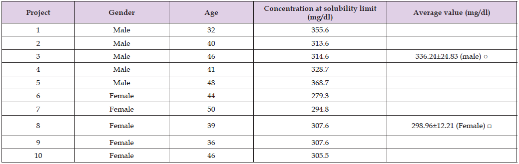 The serum uric acid solubility limit concentration value for adult males is 336.24±24.83mg/dl (n=5), while for adult females it is 298.96±12.21mg/dl (n=5), with a mean comparison P < 0.05. The serum uric acid solubility limit concentration value for adults is 317.60±27.27mg/dl (n=10). There is no significant difference between the sample values (Table 1).