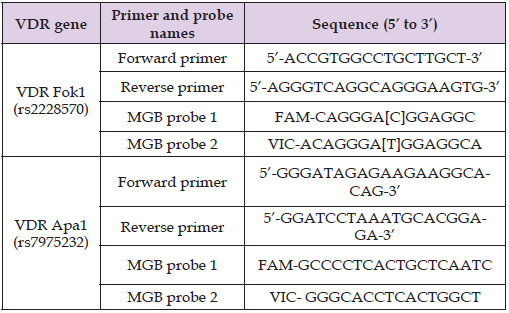 Genotyping of VDR gene polymorphisms (rs2228570 and rs7975232) was performed using TaqMan® SNP Genotyping Assay (Applied Biosystems, Foster City, USA), which included a predesigned mix of unlabeled polymerase chain reaction (PCR) primers and the TaqMan® minor groove binding (MGB) probes (FAM™ and VIC® dye-labeled). The primers and probes used for both genesare mentioned in Table 1.