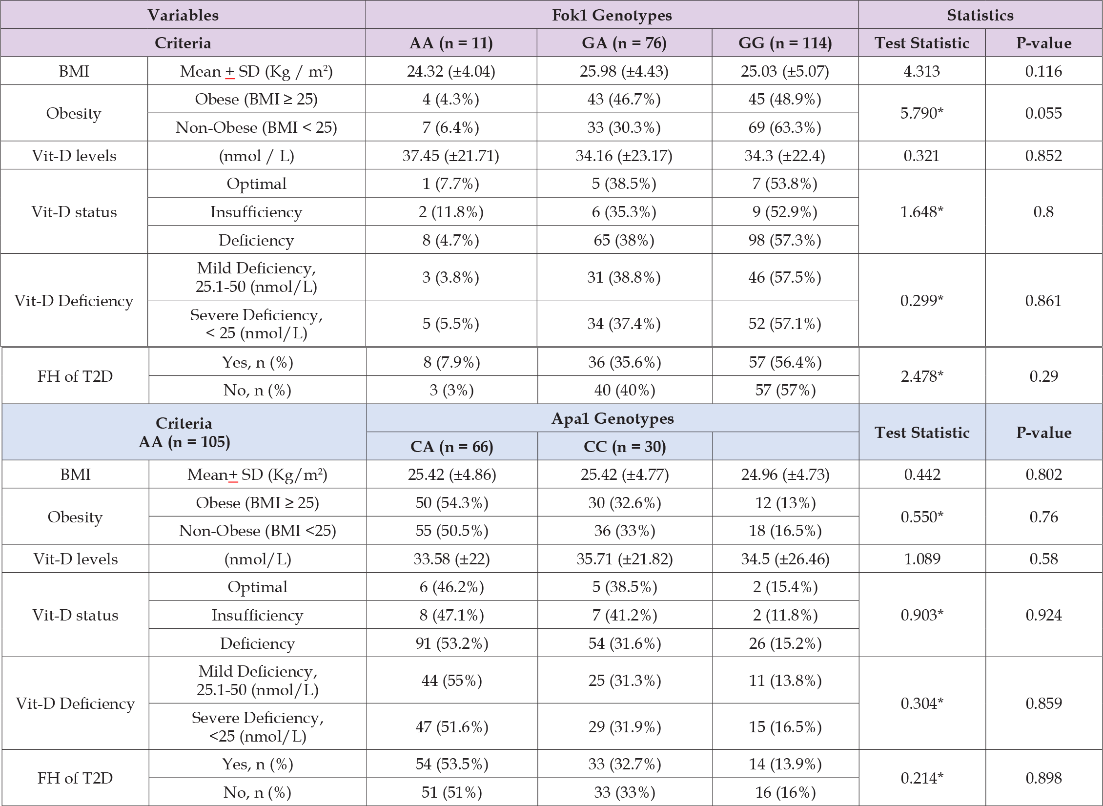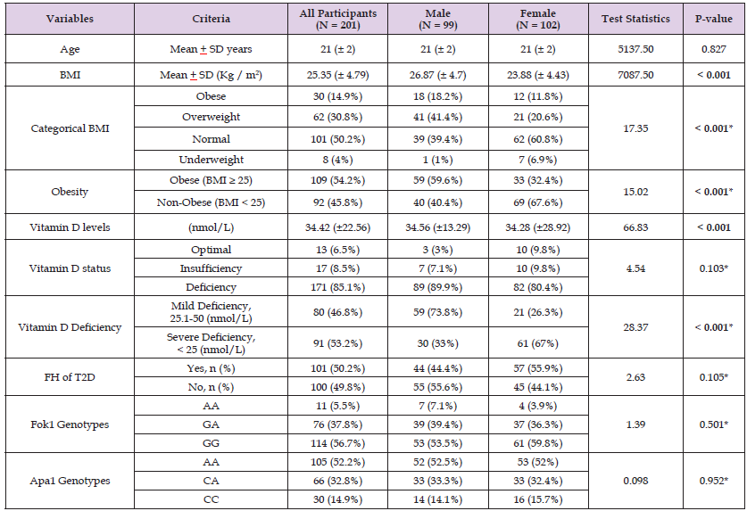 In this study,201 students, including 99 males and 102 females, with mean age of 21.0+ 2.0 years and mean BMI of 25.35 ± 4.79 (Kg / m2). The BMI, obesity, vitamin D status, and vitamin D levels showed statistically significant difference between males and females, with majority of males 59 (59.6%) were obese as compared to females 33 (32.4%). Additionally, vitamin D deficiency was most commonly reported among 89 (89.9%) males than 82 (80.4%) females. Furthermore, females (55.9%) had more positive family history of T2D than males (44.4%), although this difference between groups was not statistically important (p = 0.105; Table 2). While determining relation of Fok1 and Apa1 genotypes with, obesity, FH of T2D, vitamin D status, and deficiency, there is no statistically significant relation found (p > 0.05; Table 3). The Fok1 and Apa1 genotypes did not relate to Body Mass Index categories or vitamin D status as tested by the Kruskal- Wallis H test (Fok1 p=0.237, Apa1 p=0.459). The Fok1 GG genotype appeared most often in the normal BMI group (56.1%) while the Apa1 AA genotype dominated both normal (47.6%) and overweight (34.3%) groups. The severe vitamin D deficiency group contained 45.6% participants with Fok1 GG and 44.8% participants with Apa1 AA genotypes. The results show that genetic variation does not affect body weight status or vitamin D level groups (Table 4).
