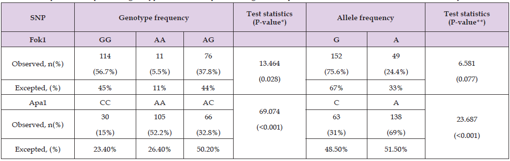 <0.001). As for genotype frequencies distribution, Fok1 (AG: 37.8%; AA: 5.5%; GG: 56.7%), and Apa1 (AC: