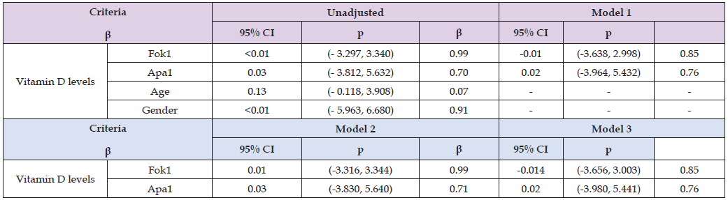 In Table 6, linear regression model was performed to determine the predictors of vitamin D levels, neither Fok1 nor Apa1 SNPs were significant predictors of vitamin D levels in this study population, even after adjusted for age and gender (Fok1 p = 0.85, Apa1 p = 0.76; model 3). Age showed a marginal association with vitamin D levels in the unadjusted model (β = 0.13, p = 0.07). Therefore, Fok1 and Apa1 SNPsplus age and gender were not associated with vitamin D levels. Fok1 and Apa1 SNPs were not statistically significant predictors of linear BMI or categorical BMI (p > 0.05) determined using linear and logistic regression analysis. For Fok1, GG genotype insignificant association for continuous BMI (β-coefficient: 0.40, 95% CI: -0.452 to 1.260; p = 0.35) and for categorical BMI (OR =1.18, 95% CI: 0.801 to 1.750; p = 0.39). Similarly, for Apa1, the CC genotype (p = 0.35) and GG genotype showed no consistent association between continuous and categorical BMI(β=0.40, 95% CI 0.452 to 1.260, p=0.35; OR=1.18, 95% CI 0.801 to 1.750, p=0.39) respectively. Therefore, Fok1 and Apa1 SNPs were not the predictors of BMI either continuous or categorical (Table 7).