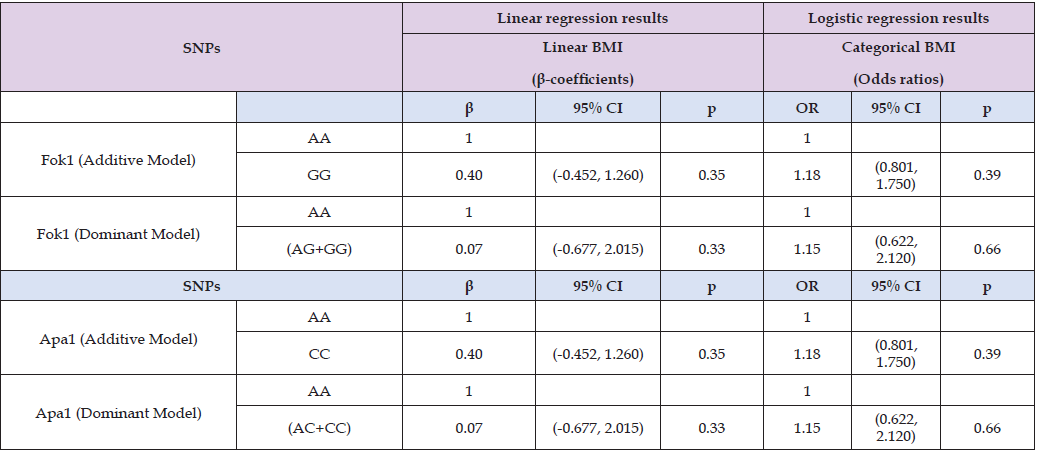 Results: Fok1 and Apa1 were not significant predictors of obesity (p > 0.05) when analyzed BMI as a continuous