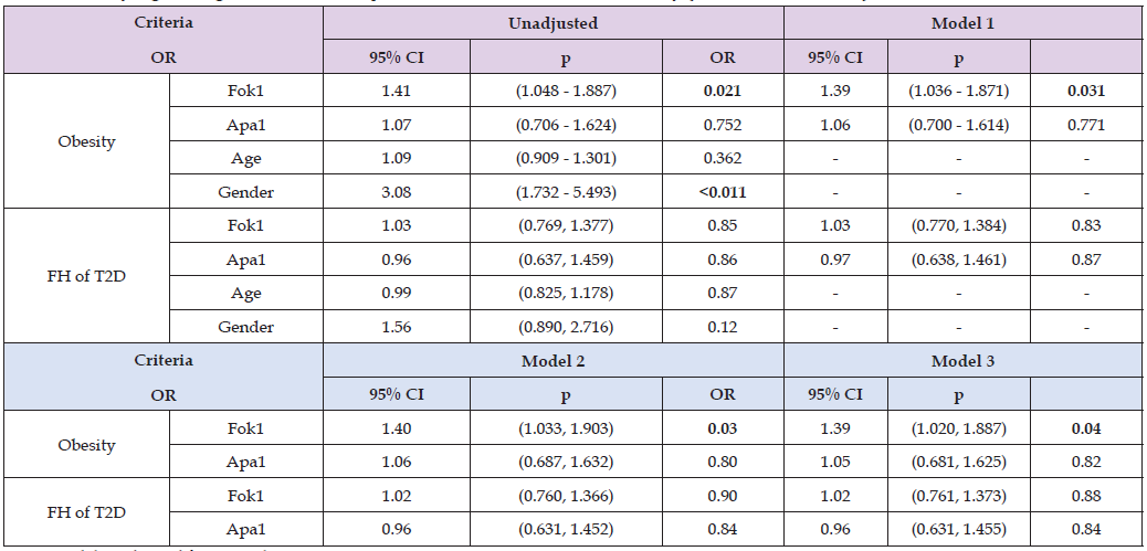 Apa1 and Fok1 association with Family History (FH) of T2D was determined using binary logistic regression. All