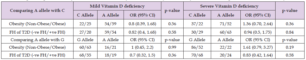 Table 9: Logistic regression analysis of allelic association (A vs C and A vs G) with obesity and FH of T2D against vitamin D deficiency.
