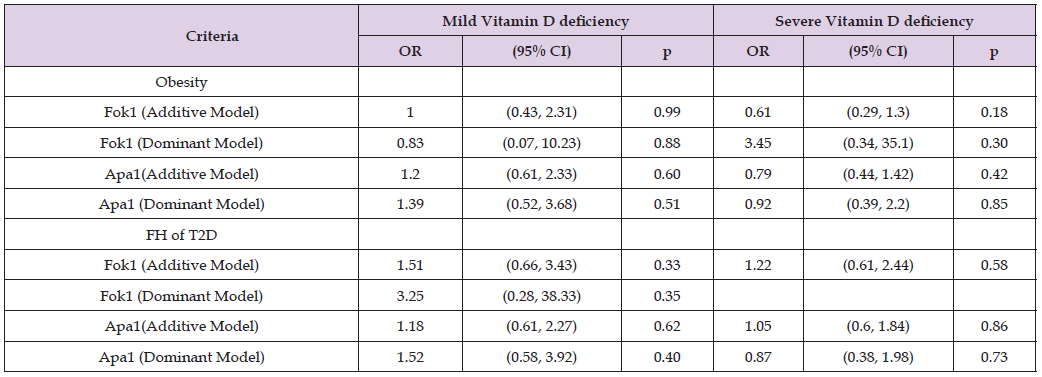 Table 10: Logistic regression analysis of Fok1 and Apa1 models (Additive versus Dominant) for obesity, FH of T2D across vitamin D deficiency.
