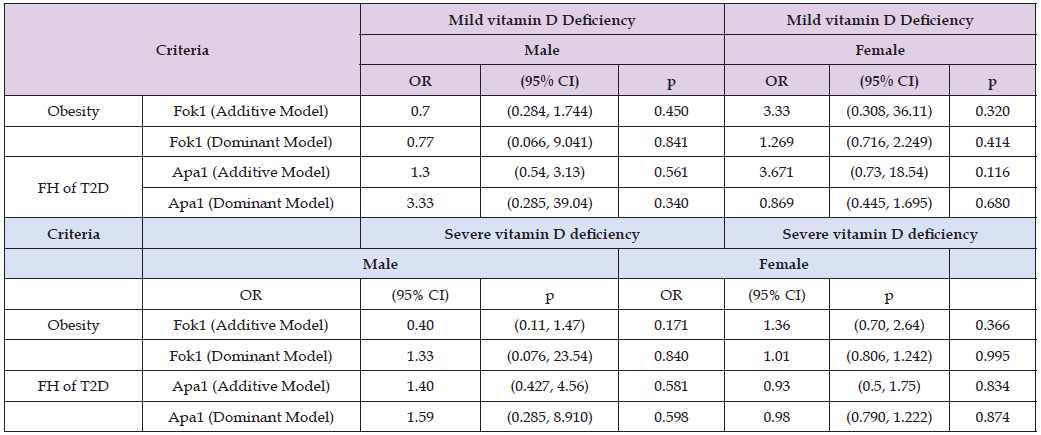 In Table 11, while determining the association of Fok1 and Apa1 SNPs with metabolic syndrome components, it was found that Fok1 and Apa1 SNPs were not significant predictors of metabolic syndrome (p > 0.05). However, vitamin D deficiency was significantly associated with some of metabolic syndrome components such as waist circumference (p < 0.001), BMI (p = 0.046), systolic blood pressure (p = 0.002), and triglycerides (p = 0.006), but fasting blood sugar (0.546), diastolic blood pressure (0.976), HDL (0.220) showed insignificant association. Therefore, vitamin D deficiency displayed greater impact on some of metabolic syndrome components. In gender specific logistic regression analysis, Fok1 and Apa1 SNPs were not significant predictors of obesity or FH of T2D across mild and severe vitamin D deficiency in both males and females (p > 0.05). While some patterns were observed, such as an OR of 3.33 (95% CI, 0.308-36.11, p = 0.320) for theFok1 additive model in females with mild deficiency, and an OR of 3.33 (95% CI, 0.285, 39.04, p = 0.340) for Apa1 dominant models in males with mild vitamin D deficiency, although statistically significant was not achieved. Therefore, no influence of Fok1 and Apa1 SNPs were observed on vitamin D deficiency, FH of T2D and gender specific risk of obesity (Table 12).