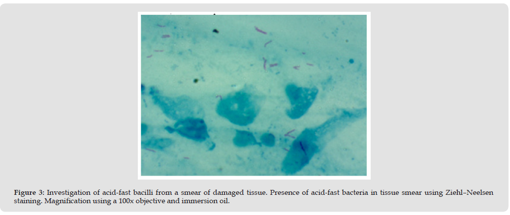 In cases of cutaneous infection by atypical mycobacteria, pyogranulomatous inflammation of the subcutaneous adipose tissue, overlying dermis, abdominal fascia and underlying musculature is histologically observed [5,8,9]. Mycobacteria are usually difficult to observe in Ziehl–Neelsen-stained tissue sections, although acid-fast bacilli can be detected within macrophages or extracellular lipid vacuoles [5,19]. In this case report, the histopathological examination provided elements for establishing the diagnosis, prior to microbiological identification, through the presence of granulomas, although mycobacteria can be seen in 50% of cases, especially those in the fast-growing group [19]. Although it is not always possible to directly observe mycobacteria from exudate or fragments of damaged tissue stained by the Ziehl-Neelsen method, examination of damaged tissue decals allowed the observation of acid-resistant microorganisms. Fine needle aspirates or smears from skin lesions (ulcers, drainage tracts) or granulomatous lymph nodes should be stained for acid-fast bacteria using the Ziehl-Neelsen method [13,19]. The sensitivity of the test is variable, since the number of bacteria within the macrophages varies depending on the mycobacterial species and host’s immune response [1,5,8]. Even when mycobacteria are visualized in material stained by the Ziehl-Neelsen method, it is important to perform a bacterial culture to differentiate atypical mycobacterial infections from those originating from feline leprosy, nocardiosis or tuberculosis [4,19]. Culture of a fresh tissue sample is useful for confirming mycobacterial infection and identifying the species involved, and has implications for treatment, prognosis and assessment of zoonotic risk, and is usually performed in a specialized laboratory. As many mycobacterial species grow slowly or do not grow in culture media, it is advisable to send tissue samples for examination using polymerase chain reaction (PCR) [27].
