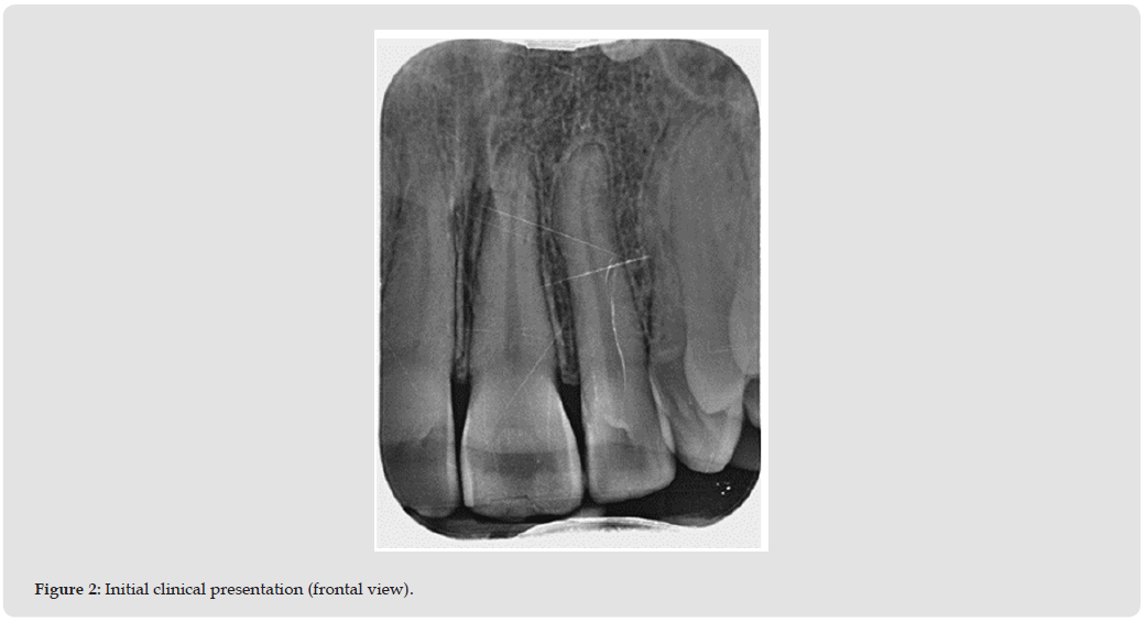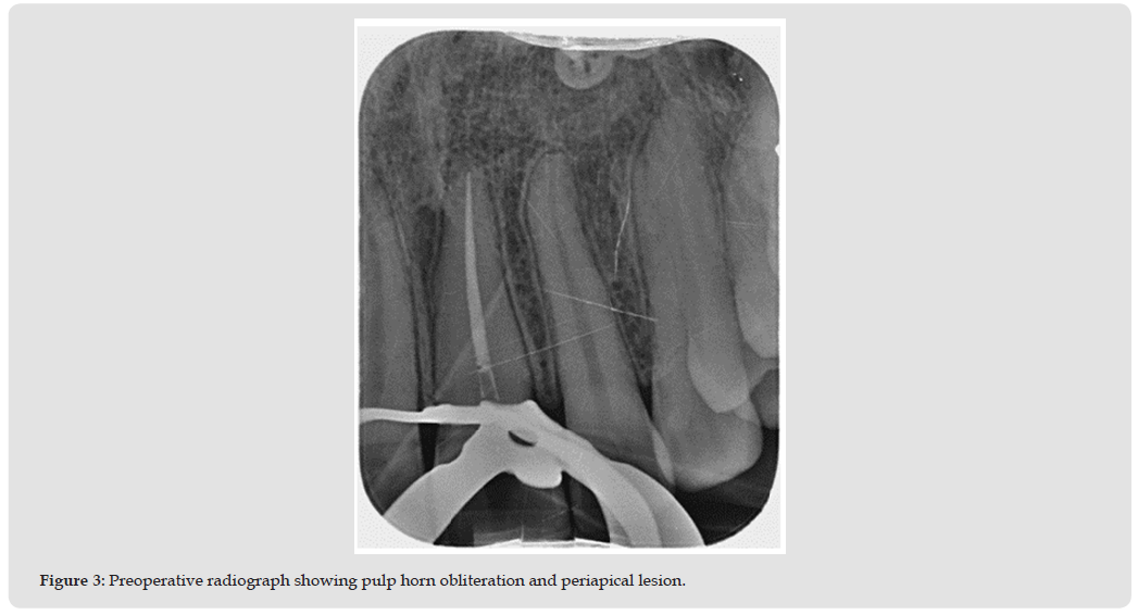 - Apical radiograph showed pulp horn obliteration and an incipient periapical lesion (Figures 1 & 2).