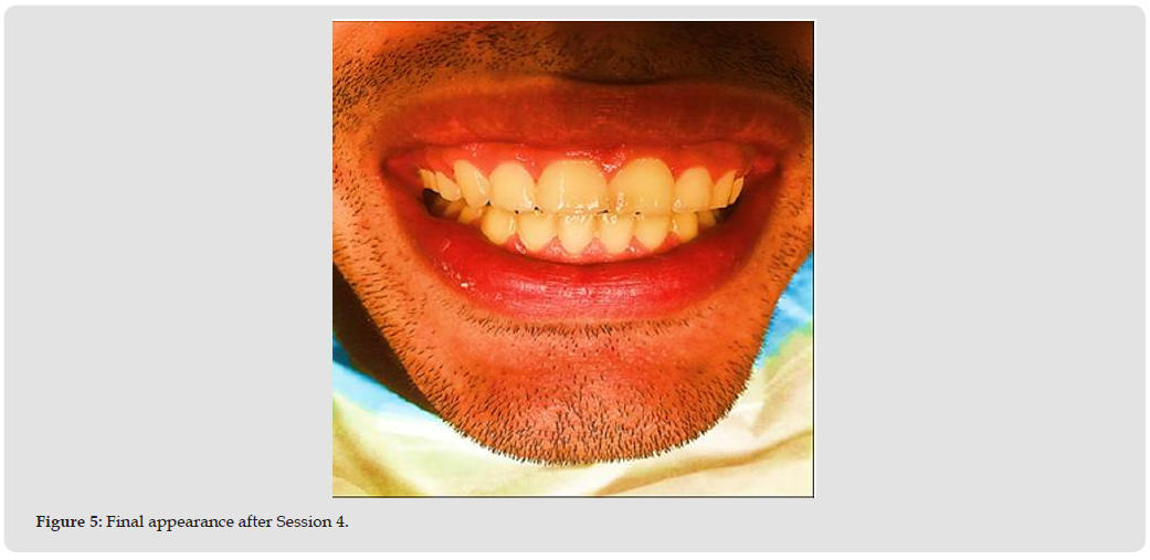The discoloration resolved entirely without over-whitening the surrounding enamel. The patient experienced no post-operative pain and expressed high satisfaction [11-13]. A one-year follow-up was planned to monitor periapical healing and long-term success.