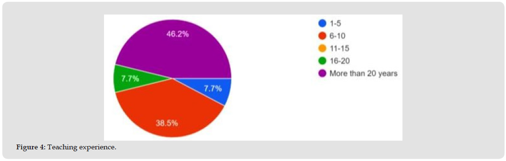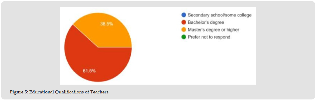 The findings reflect participants’ responses to these research questions, which guided the data analysis. The perceptions of teachers regarding feedback aimed at improving science education were considered. Figure 1 illustrates the diverse age range of teachers involved in this study, 30.8% of the teachers were aged between 50 and 59, another 30.8% fell within the 40 to 49 age group, 15.4% were aged 30 to 39, 15.4% were between 25 and 29, and 7.7% were under 25 years old. Figure 2 illustrates the gender distribution among the participating teachers. Among those who completed the surveys, 61.5% identified as female, while 38.5% identified as male. Notably, no respondents selected the “prefer not to respond” option on the survey. Figure 3 illustrates the racial diversity among the teacher participants. Notably, 84.6% of the teachers identified as White, while 7.7% identified as Hispanic, and an additional 7.7% identified as Asian or Pacific Islander. Figure 4 illustrates the years of experience reported by the teacher participants. Among those surveyed, 46.2% have over 20 years of teaching experience, 38.5% possess 6 to 10 years, 7.7% have 16 to 20 years, and another 7.7% have between 1 to 5 years. Figure 5 illustrates that 38.5% of the participating teachers possess only a bachelor’s degree, while 61.5% have obtained a master’s degree or a higher qualification.