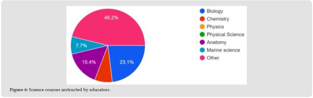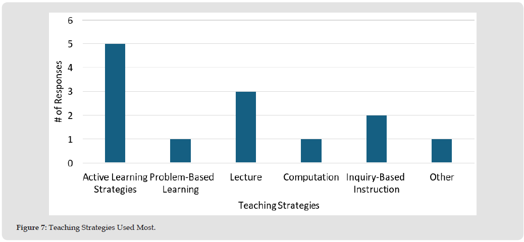 Figure 6 shows that participating teachers indicated they teach a variety of science courses, 23.1% teach biology, 15.4% teach anatomy and physiology, 7.7% teach marine science, 7.6% teach chemistry, and 46.2% teach other science courses. In relation to the research question: What are high school science teachers’ views on effective strategies to enhance student interest and engagement in science courses? This research question explores high-quality, adaptable science education strategies that foster a deep understanding of science concepts, benefiting students throughout their academic and professional journeys. The teachers survey featured three items that focused on participants’ self-reported practices and beliefs about specific instructional strategies, their adaptability in assessment and teaching methods, and their incorporation of student feedback. The survey aimed to address this research question by asking teachers to identify the teaching strategies they frequently employ in their classrooms. The options provided were:
