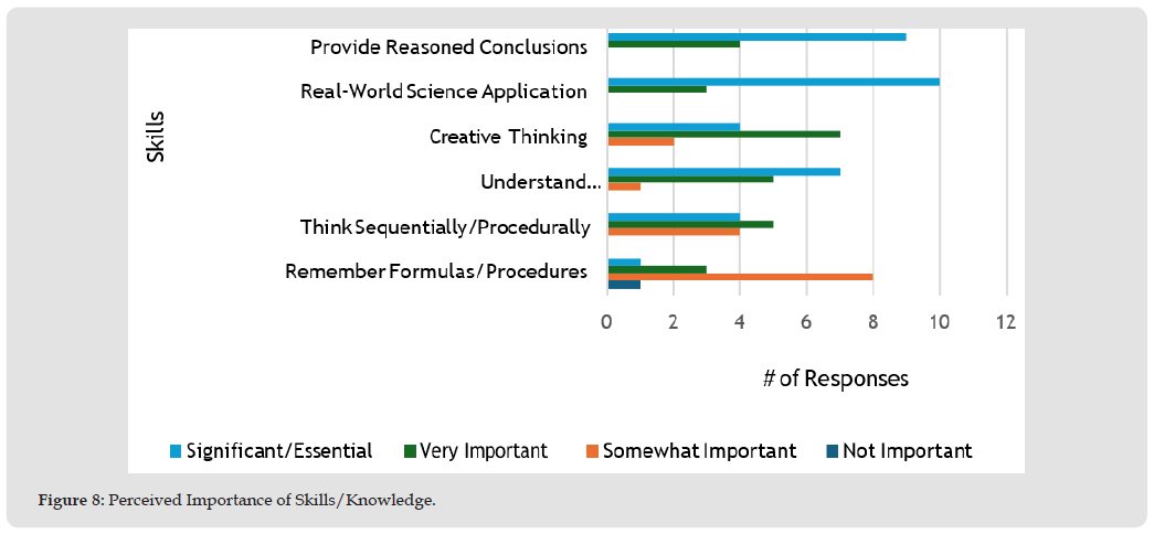Among the responses, most teachers selected active learning strategies, with five choosing this option. Traditional science instruction (lecture) was the second most common strategy, indicated by three teachers. Two teachers favored inquiry-based instruction as their primary approach. Among the teachers who participated in the survey, problem-based instruction, computation, and the “other” category were the least utilized, with only one teacher selecting each of these strategies. Figure 8 illustrates the teacher survey participants’ perceptions of the importance of each of these skills. To gain a deeper understanding of teachers’ perceptions regarding effective and engaging instructional strategies, the survey question, “How important is it that you cultivate the following skills/knowledge in your students?” The skills listed included: