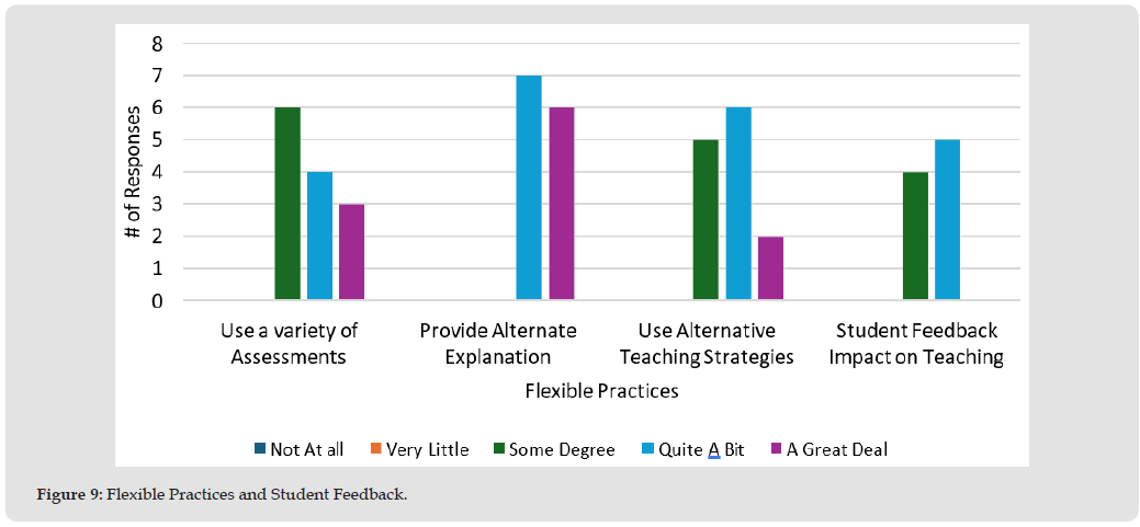 Figure 9 illustrates flexible practices and student feedback. Among the flexible practices discussed, the use of varied assessments and alternative teaching strategies elicited the widest range of responses. For varied assessments, no teachers chose “not at all” or “very little.” Seven teachers indicated they utilized various assessments to “some degree,” five responded with “quite a bit,” and three reported using them “a great deal.” The feedback regarding alternative teaching strategies reflected a similar pattern, with no respondents selecting “not at all” or “very little.” Six participants indicated “some degree,” seven chose “quite a bit,” and two indicated “a great deal” concerning their implementation of these strategies. The practice of providing alternative explanations for students who struggle to understand received the highest ratings. None of the teacher participants chose the not at all, very little, or some degree options for this practice. Eight teachers noted they did this quite a bit, while seven reported providing alternative explanations a great deal. When it comes to the influence of student feedback on teaching methods, none of the teachers indicated that they use feedback not at all or very little. Four teachers reported using it to Some Degree, six stated they utilize it quite a bit, and five mentioned they apply it as a great deal. The second research question was: To what degree do high school science teachers feel that their professional development supports the implementation of innovative and engaging instructional methods? The success of initiatives aimed at achieving high educational standards largely hinges on the effectiveness of teachers and their capacity to develop the necessary content knowledge and instructional techniques required for high academic performance [52].