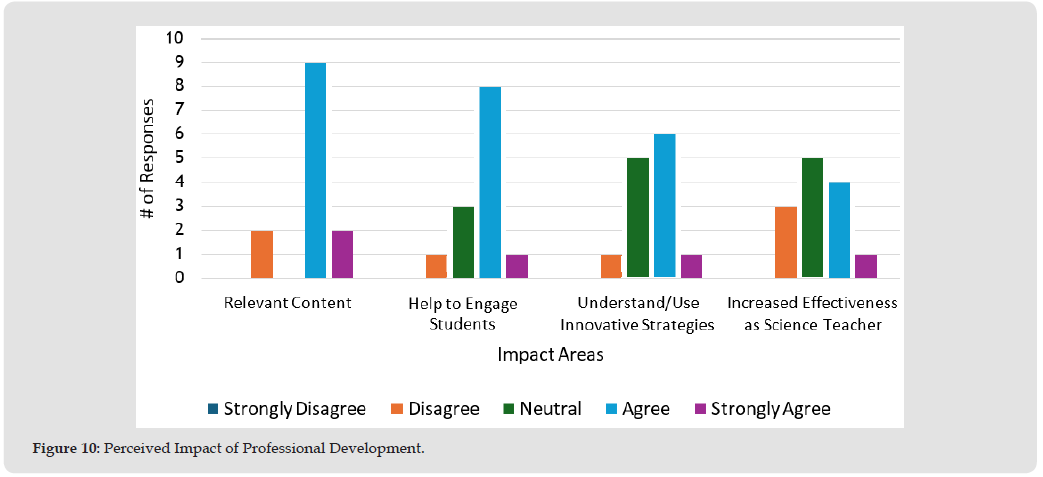 Notably, none of the participating teachers selected Strongly Disagree for any of the statements, and it is interesting to note that no two teachers provided the same response for all statements. Most respondents felt that their professional development experiences were relevant to their job roles. Specifically, in response to the first statement, two participants chose disagree, none selected neutral, eleven opted for Agree, and two indicated strongly agree. Responses regarding the impact of professional development on teachers’ abilities to engage students and to understand and apply innovative instructional strategies showed some variation, yet a majority responded positively. For the second statement about engaging students, one teacher disagreed, three were neutral, ten agreed, and one strongly agreed. The responses regarding the third statement about understanding and utilizing innovative strategies leaned positive as well, although there were more neutral responses. One teacher disagreed, six were neutral, seven agreed, and one strongly agreed concerning the extent to which their professional development aided their understanding and use of innovative instructional strategies. Overall, responses regarding how professional development contributed to their effectiveness as science teachers tended to cluster in the middle of the scale.