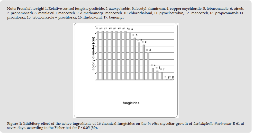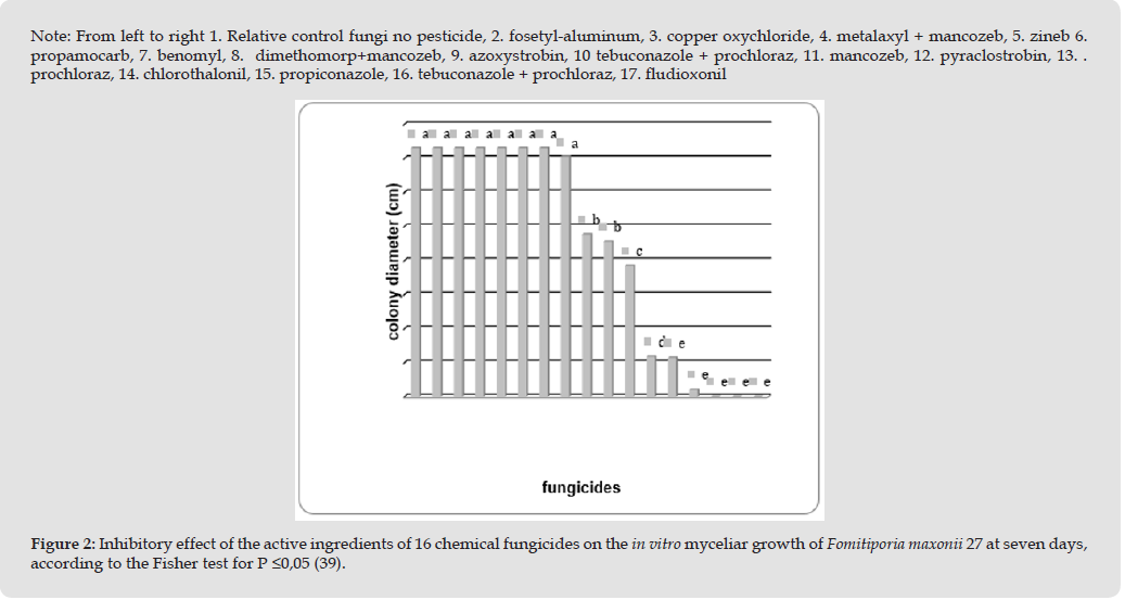 They were followed by benomyl and propiconazole, which did differ from each other and from the first three. The least effective active ingredients against this fungus were: fosetyl – aluminum; metalaxyl + mancozeb; zineb; propamocarb; azoxystrobin; tebuconazole and copper oxychloride, all without significant differences between themselves or with the control. According to Halleen, et al. [25], the active ingredients of the fungicides benomyl, imazalil, prochloraz and flusillasole, among others, were the most effective against fungal species belonging to the genus Cylindrocarpon, often associated with species of the genus Phaeoacremonium [18]. Although some active ingredients, such as fludioxonil, are registered on the Official List of Authorized Pesticides in Cuba [26] only for seed disinfection, there is evidence of their effectiveness primarily against the phytopathogenic fungi L. theobromae, F. maxonii, N. mangiferae [5,12], and Phaeoacremonium sp., [18] justifying their application in the chemical control of these fungal diseases in Cuban fruit trees [15,27-32]. However, it is necessary to validate the efficacy of each of these fungicides under field conditions in Cuban fruit production, in conjunction with environmental toxicological research [33-35], as well as their cost-benefit analysis. This provides solid support for the alternation of these fungicides with a wide variety of active ingredients to prevent the induction and selection of resistance in this range of phytopathogenic fungi associated with fruit production [36-38].