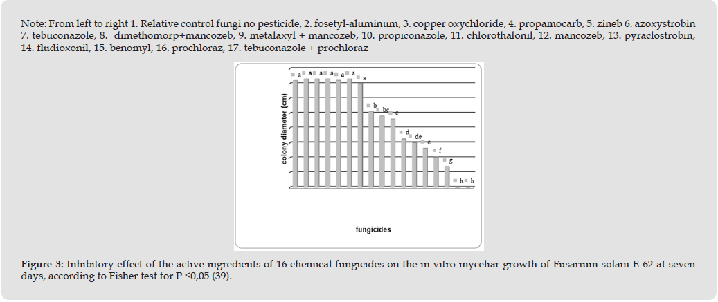 For F. solani, the most effective active ingredients to inhibit its mycelial growth in vitro at seven days were tebuconazole + prochloraz and prochloraz no statical differences between them for P ≤0.05, followed by benomyl and fludioxonil as is shown on Figure 3, these fungicides had statical differences s between these and with the first two, the only ingredients that inhibit the growth of the mycelium of these fungi by 100%. The least effective ingredients against F. solani were: azoxystrobin, fosetyl-aluminum, copper oxychloride, propamocarb, zineb and tebuconazole; not statical differences between themselves compared to the None had statistical differences between them only with the Petri dish control without pesticide only with the growth of the phytopathogenic fungi. The results achieved in the case of F. solani with tebuconazole + prochloraz and prochloraz, followed by benomyl and fludioxonil, coincide with those achieved by Ferrer, et al. [19] when they evaluated their action against Fusarium sp. The effectiveness of these active ingredients generally lies in its action at the level of tubulin in the cell, that prevents mitosis from taking place and thus the growth of the mycelium [23]. The least effective active ingredients against this fungi turned out to be: tebuconazole; zineb; copper oxychloride; azoxystrobin; fosetyl – aluminum and propamocarb, none had none had statistical differences between them only with the Petri dish control without fungicide with the growth of the phytopathogenic fungi tested [21,22,24].