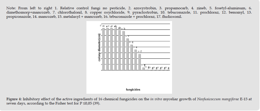 For Neofusicoccum mangiferae, the most effective active ingredients to reduce the in vitro mycelial growth of this fungi, after seven days were: propiconazole; mancozeb; fludioxonil; tebuconazole + prochloraz; benomyl; metalaxyl + mancozeb and prochloraz, non-statical differences between them for P ≤0.05 (Figure 4), followed by tebuconazole and pyraclostrobin with statical differences between the latter and with the first seven, in this case only propiconazole; mancozeb, metalaxyl + mancozeb, tebuconazole + prochloraz and fludioxonil inhibited 100% of the mycelial growth of N. mangiferae [20]. In the opposite way the least effective active ingredients against this fungi were: fosetyl-aluminum; zineb; propamocarb and azoxystrobin, all non-statical differences between. The results achieved with prochloraz and tebuconazole coincide with those obtained by Torres, et al. [22], They pointed out, among other active ingredients, tebuconazole and prochloraz as the best to inhibit both conidial germination and mycelial growth of N. australe and N. parvum. Torres, et al. [22] also considered that a higher dose was required to inhibit the conidial germination of these fungi. Finally, in the case of the phytopathogenic fungi Phaeoacremonium sp., the best active ingredients with 100% inhibition of mycelial growth were: tebuconazole + prochloraz; fludioxonil and prochloraz as is shown on Figure 5), had not statistical differences between them for p ≤0.05.