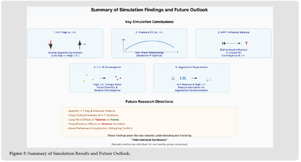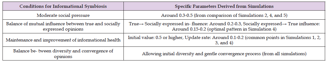 Simulation 4 is considered closest to the ideal state of informational symbiosis. In this simulation, the di- vergence between true and socially expressed opinions is minimal, and informational health maintains a high level. Additionally, the process of gradual convergence from initial diversity of opinions is observed. The simulation results suggest the following elements as important conditions for achieving such a state: To apply these conditions to real society, not only improvement of individual media literacy and critical thinking skills but also reconsideration of social institutions, design of dialogue venues, and cultural norms are necessary. Particularly important is the perspective that an appropriate balance of the dual structure of true and socially expressed opinions leads to informational health and healthy consensus formation, rather than viewing it merely as a problem (Table 6).