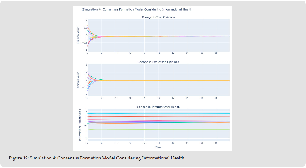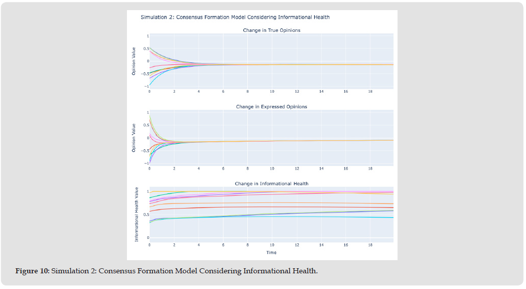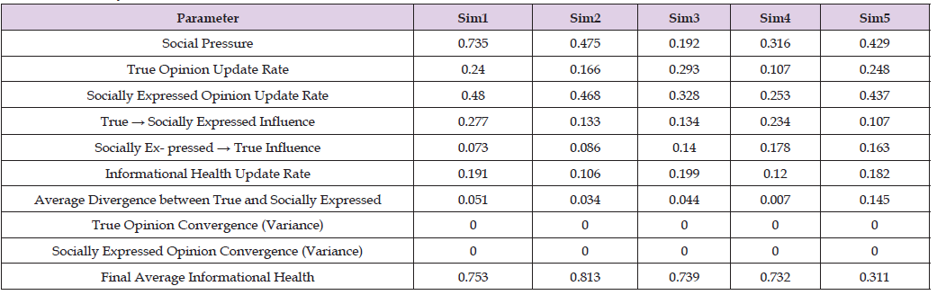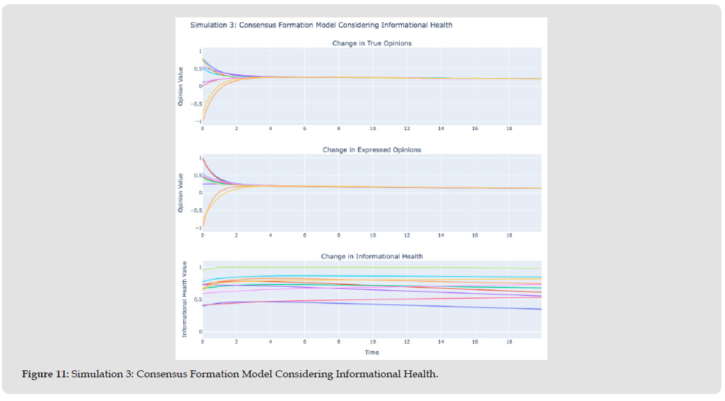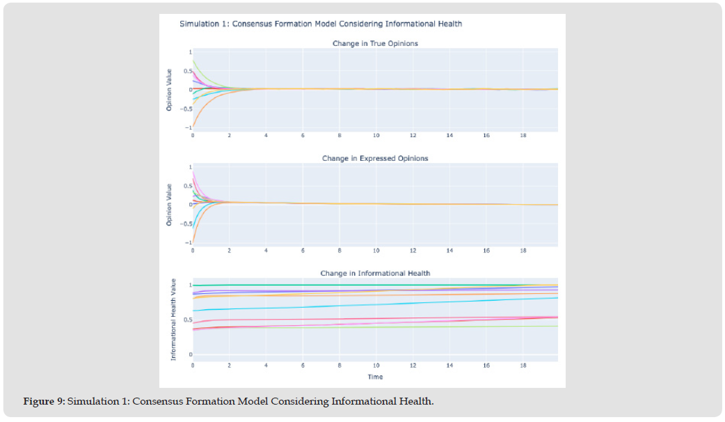 • In Simulation 5, the divergence between true and socially expressed opinions is maximal (0.145), while the average informational health is also lowest (0.311). This result mathematically supports that divergence between true and socially expressed opinions negatively affects informational health.