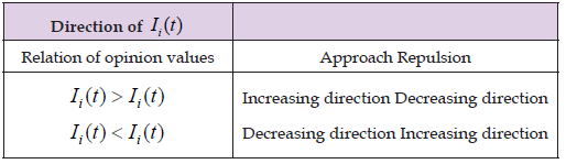 From the literature [1,3], the change in opinion is expressed by the following equation:
