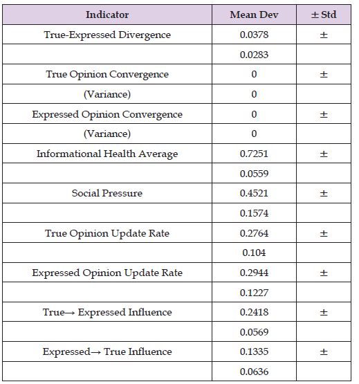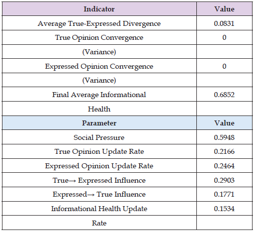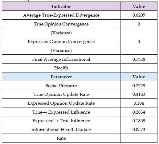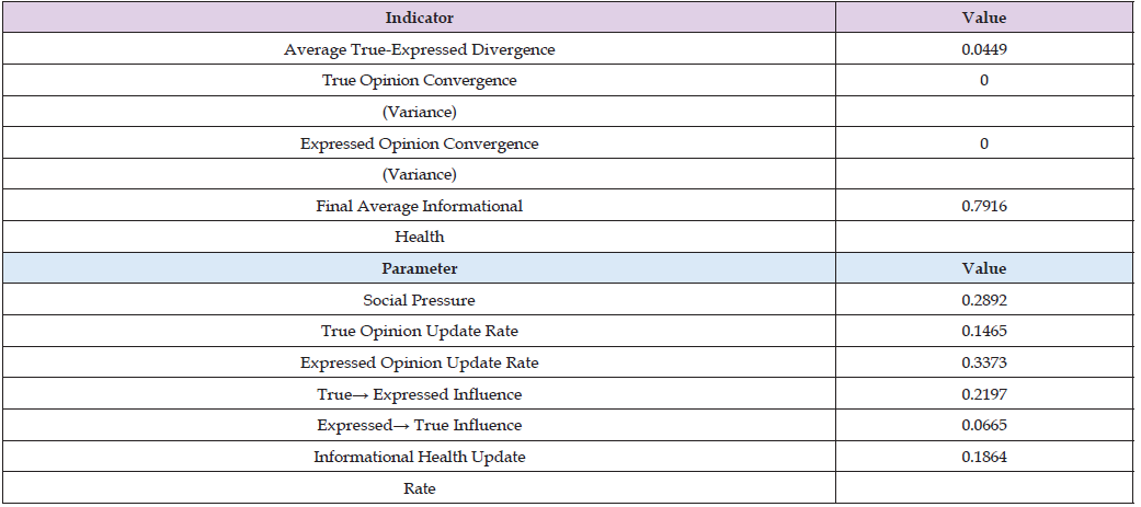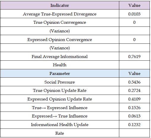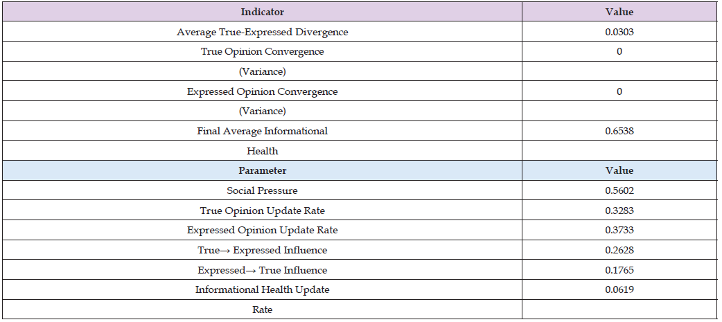 • In this simulation, despite moderate social pressure (0.429), the influence from true to socially expressed opinions is lowest (0.107), creating a large divergence between true and socially expressed opinions and significantly reducing informational health. This indicates that not only the absolute magnitude of social pressure but also the pattern of interaction between true and socially expressed opinions has a significant impact on informational health (Table 4).