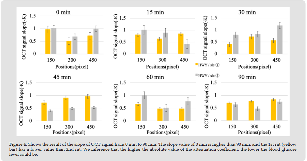 After sedation, blood was collected from the tail vein using a blood glucose measuring device (Oshieguruko, Foracare Japan Co., Ltd.) and blood glucose levels were measured. Then, glucose solution was administered intraperitoneally to each animal at 3 g/kg body weight. Thereafter, blood glucose levels were measured at 15, 30, 45, 60, and 90 minutes in the same way as before glucose administration. The OCT used is a THORLABS TELESTO320 Spectral Domain OCT. The specifications of this imaging device are a central wavelength of 1300 nm, a maximum imaging depth of 3.5 / 2.6 mm (water / air), an axial resolution of 5.5 / 4.2 μm (water / air), a horizontal resolution of 13.0 μm, and a sensitivity of 93-109 dB. This time, using this device, 2D images were taken at three locations immediately after each blood glucose measurement, and as shown in Figure 1, the signal intensities of the five left and right lines at the 150th, 300th, and 450th A-line (counting from the left) were averaged along the X-axis and calculated. An example of A-line data is shown in Figure 2. After averaging 10 A-lines as in Figure 1, data like that in Figure 2 is obtained. The area with the highest signal intensity (orange arrow) is the stratum corneum of the epidermis. A second peak (black arrow) can be confirmed below the stratum corneum. The area between the two peaks is the epidermis layer. In order to calculate the OCT attenuation coefficient this time, we aimed to obtain data from the dermis layer below the epidermis layer, so we confirmed the area between the second peak and the subcutaneous tissue where signal attenuation is almost nonexistent (red arrow) and extracted the data. curve slope should be taken from dermis layer which is on the right side of epidermal layer on this picture. After dermis layer is subcutaneous tissues where the OCT signal slope approaches 0.