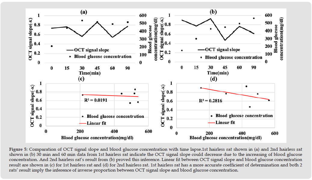 Diabetes is a chronic disease in which blood glucose levels rise above the appropriate range. Although it is rarely life-threatening, it can cause arteriosclerosis in blood vessels throughout the body, resulting in complications in various organs if we ignore it. The number of diabetes patients worldwide is increasing unstoppably, and is estimated to exceed 380 million this year, with a particularly rapid increase predicted in Asia, including Japan [1]. Diabetic patients need to measure their own blood glucose levels several times a day. Currently, small blood glucose monitors based on enzyme colorimetry and enzyme electrode methods are mainly used to measure blood glucose levels. Both methods are invasive and require blood sampling [2]. Therefore, various non-invasive blood glucose measurement methods have been proposed and are being researched. For example, there have been attempts to measure blood glucose levels using oral mucosa by an ATR prism and attempts to measure anterior aqueous humor using Raman spectroscopy and polarimetry [3]. Among them, KV Larrin, et al. [4] used optical coherence tomography (OCT) technology to evaluate blood glucose levels based on changes in the attenuation coefficient of OCT signals in the dermis layer of pig and rabbit skin [4]. Furthermore, Miura, et al. [5] used OCT to measure diffuse reflected light that penetrated the dermis layer of human skin and clarified that there is a correlation between the signal attenuation coefficient of the reflected light and blood glucose levels [6]. OCT technology is widely used in the field of bio measurement. Jing, et al. [7] used OCT to successfully observe, photograph, and measure the fine structure of the rat brain. Ohmi, et al. [8] also succeeded in measuring skin allergy reactions using guinea pigs. Wei, et al. [8] further applied OCT technology to in-vivo observation and evaluation of surgical sutures. OCT is expected to be useful in measuring skin tissue. Mice, rats, and guinea pigs are widely used as experimental animal especially on the research of skin. Hairless rat skin has a skin structure like human skin and is easy to manipulate in experiments. Based on our successful experience with animal experiments using hairless rats [9], we conducted this study using hairless rats as experimental subjects to verify the specific relationship between the OCT signal attenuation coefficient and blood glucose concentration.