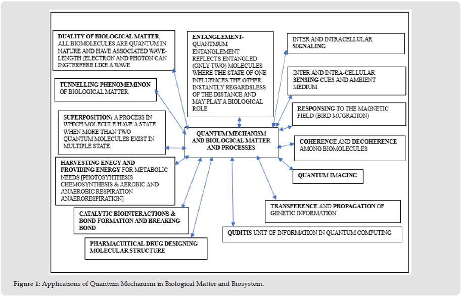 It is obvious that biological mass is the systematic accumulation of chemical elements and their behavior is based on the principles of theoretical chemistry and quantum mechanism. When the sub-atomic components interact in relation either light energy (or radiation energy) result in either formation or breakdown to next level of organization, at least in a biosystem. Impacts of quantum mechanism are very obvious in a biological interaction (Figure 1). In these interactions are observed in processes like role of electron and proton during respiration, photosynthesis, most of the physiological aspects of sensory, transduction and response related processes. Any agency like intensity of light radiation, magnetic field etc., that can influence the status of electron and proton is capable to affect the state of quantum mechanism. The works of Preston Snee, (https://libertext chemistry. org) elaborate the electron and proton tunnelling phenomenon influences and affects the distance related effects of protein and electron; this phenomenon is affected due to ambient temperature, strength of magnetic field, resonance impacts the position of these sub-atomic particles. The quantum particles have ability to tunnel through barriers as these have negative kinetic energy; the kinetic energy elevates when trapped and a change in their size, result is in change in colour (Preston [7]).