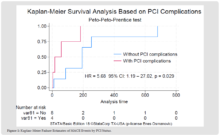 In the analyzed cohort, individual MACE events were documented in 2.06% of patients, while composite MACE was identified in 0.71%. Although the PCI procedure itself was not a significant predictor of MACE (HR = 1.57, p = 0.410), key risk factors for MACE development included acute stent thrombosis (HR = 2.77, p = 0.001) and contrast- induced acute kidney injury (CA-AKI) (HR = 2.17, p = 0.049) (Figure 2). The Kaplan-Meier analysis highlighted a significantly increased incidence of MACE among patients undergoing PCI (Peto-Peto- Prentice test: p = 0.0263). The cumulative risk function revealed an early divergence between curves, depending on whether PCI was performed. Patients with procedural complications demonstrated an even greater risk increase compared to those without complications. These findings emphasize the need for heightened monitoring of high-risk patients, particularly those with a history of myocardial infarction (MI), chronic kidney disease (CKD), and diabetes. These comorbidities are well recognized risk factors for CA-AKI and thrombotic complications. Prolonged dual antiplatelet therapy (DAPT) and early identification of patients with renal dysfunction could significantly reduce MACE risk. Our results are consistent with prior multicenter analyses, which identified acute stent thrombosis and CAAKI as critical risk factors for MACE [3,4]. Targeted preventive strategies and optimized management of these complications can improve outcomes and mitigate risks in PCI patients. Kaplan-Meier curves, illustrated in the figures, depict the incidence of MACE based on PCI status and the presence of procedural complications.