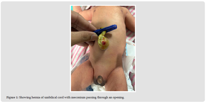 in the umbilical cord. Examination showed an umbilical swelling with an opening through which the meconium