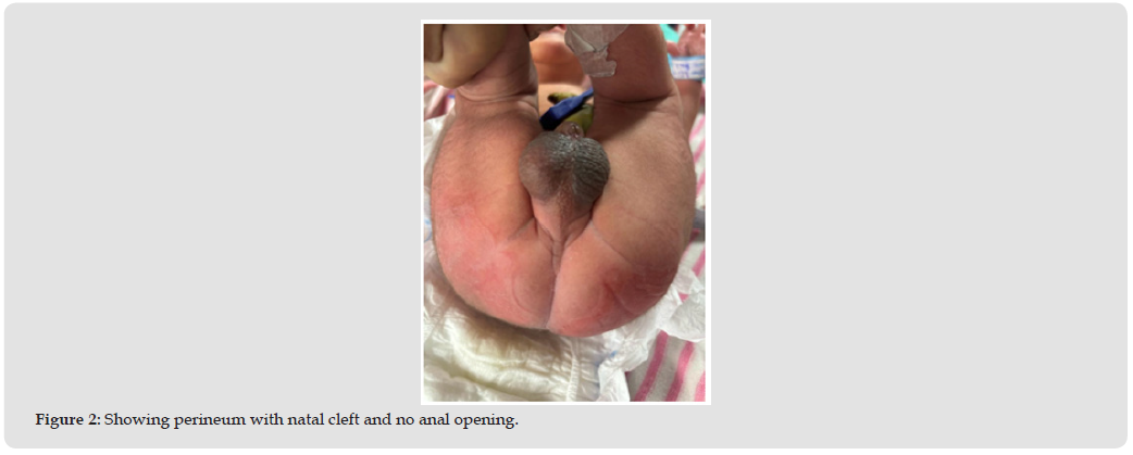 The patient was born via normal vaginal delivery at a tehsil headquarters in Sharakpur. They were referred to our tertiary care hospital due to swelling in the umbilical cord and an imperforate anus.