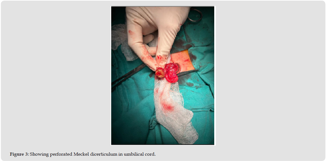 IV lines were inserted, and fluids were administered for resuscitation. Prophylactic antibiotics were given, and blood grouping and cross-matching were performed. The patient was counseled and informed consent was obtained for surgery. After optimization and investigation, the patient underwent operation 24 hours later. Exploration was carried out through the umbilicus. The umbilical cord was opened, and the ileum was separated from the cord. It was discovered that the perforated Meckel was attached to the cord and was draining meconium through a small hole in the wall of the umbilical cord (Figure 3). The Meckel’s diverticulum was resected along with a segment of the bowel. An end-to-end anastomosis was then performed. In addition, for the imperforate anus, a loop colostomy was created at the distal descending colon. After surgery, the patient was transferred to the surgical neonatal ICU for postoperative care. For the first two days, the patient was kept fasting and clear liquids, followed by regular feeding, which was started after 48 hours. The patient’s recovery was uneventful, and he was discharged with instructions for wound care and colostomy care. A follow-up appointment was scheduled for 7 days later.