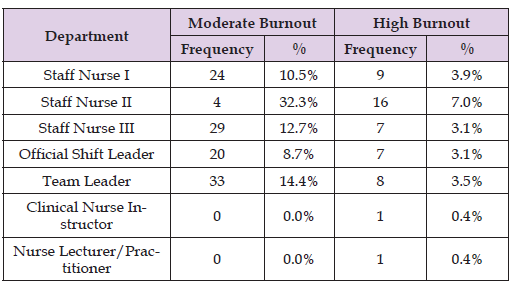 Official Shift Leaders and Team Leaders, who typically have more responsibilities reported moderate burnout in 20 (8.7%) and 33 (14.4%) nurses, respectively.
