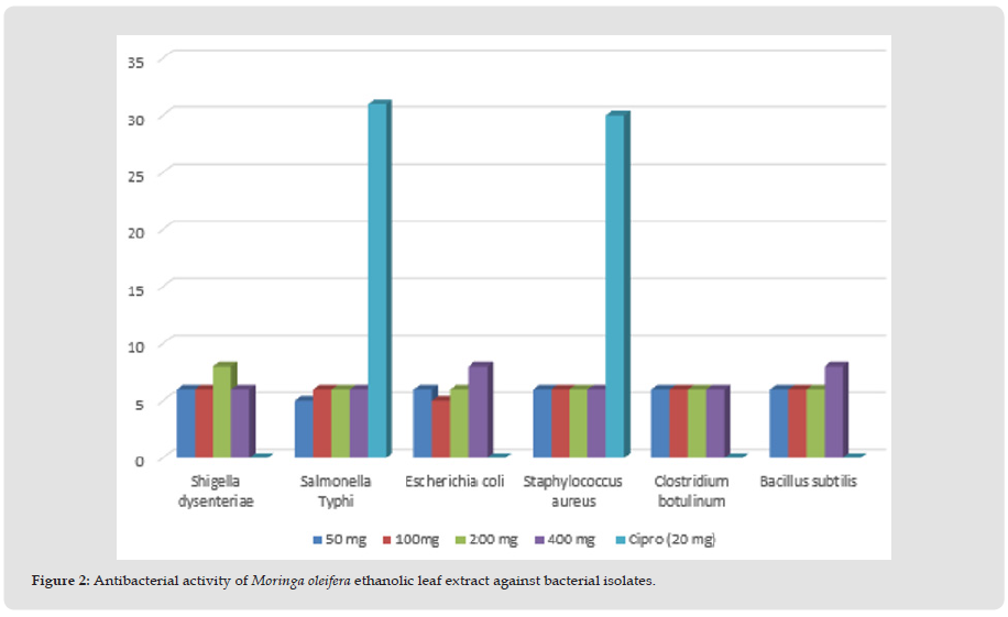 The ethanolic extracts of Moringa oleifera demonstrated insignificant antibacterial activity against bacterial isolates at all concentrations (Figure 2). Ciprofloxacin (control) again showed inhibition zones of 31 mm for S. typhi and 30 mm for Staphylococcus aureus, and insignificant inhibition zones of 0.0 mm each for Shigella dysenteriae, Escherichia coli, Clostridium botulinum and Bacillus subtilis.