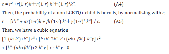 The relative probability (relative to non-LGBTQ+) k” is the probability that both LGBTQ+ persons procreate. If one child is born with a certain proportion of non-LGBTQ+ and LGBTQ+ children based on the establishment of such pairs, the genetic flow will be as shown in (Figure 3). Here, let r’, α, β, and γ be the probabilities that the child born from each of the four pairs is non-LGBTQ+. The probabilities that they are LGBTQ+ are 1-r’, 1-α, 1-β, and 1-γ, respectively. At this time, the following three-dimensional equation (1) holds true for the proportion r of non-LGBTQ+ people in a steady steady state. (See Appendix Ap2)