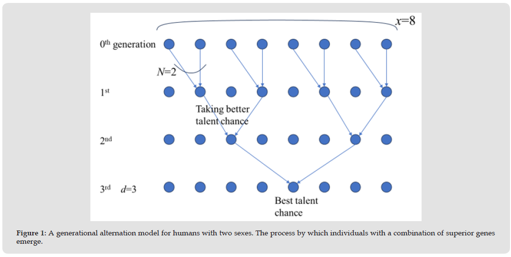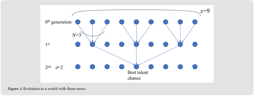 Although sexual reproduction requires twice as much effort as asexual reproduction, its superiority under various changing environments has been demonstrated [3]. Further, paramecium have many sexes, and a paramecium with sixteen sexes has been reported [4]. Therefore, how many sexes are appropriate from the perspective of human evolution? In this paper, as an evaluation function where the number of sexes (complexity) is moderately small and the number of generations required for evolution is also small, the number of sexes whose these product is the minimum is derived. (Figure 1) shows a generational alternation model for humans with two sexes (N = 2). Where the number of individuals is x = Nd = 8, offspring with a combination of talent genes from all people will be born in d = 3rd generation. In a living organism (human) with three sexes, genes from three individuals combine to produce one child. Where x = Nd = 9 people, in the 2nd (=d) generation, talents from all individuals are combined, and progeny with a combination of genes will be born (Figure 2).