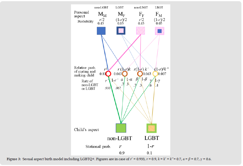 Simply thinking, it must be difficult for LGBTQ+ people to produce children. However, there is always a percentage of LGBTQ+ people in the population. Recently, a large-scale genetic analysis of nearly 500,000 people revealed that although there appears to be a relationship between sexual orientation and genetic factors, there is no specific gene that determines sexual orientation (Ganna, et. al. Science [5]). The author used a pairing model that includes this information and the more comprehensible LGBTQ+ persons whose body and mind do not match, where under realistic parameter conditions, a few percent of LGBTQ+ children are always born at a steady rate. The model was derived as follows. Non-LGBTQ+ (sometimes referred to as heterosexual or cisgender but referred to here as non-LGBTQ+) and LGBTQ+ are represented by MM, MF, FF, and FM. The physical nature is indicated by the capital letter, and the mental nature is indicated by the subscript. Supposing that the human genetic distribution is in a steady state, the male-to-female ratio is 1:1 symmetrical, the probability of non-LGBTQ+ existence (birth) is r, and that of LGBTQ+ birth is 1-r; k, k’, k” are the probabilities of mating preferences and producing a child between the aspects. In other words, k and k’ are the probability that a non-LGBTQ+ person procreates with an LGBTQ+ person of the physically opposite sex.