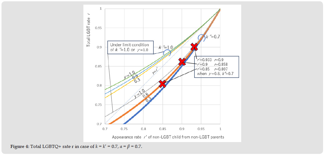 However, to determine the limit, we also show the solution curve with k’ changed to the maximum limit value of k’=1.0. Similarly, the solution curve with γ = 1.0 (maximum limit) is also shown to determine the limit. The thick lines and × marks are typical curves and typical examples, respectively. Usually, because the non-LGBTQ+ ratio r is larger than that of LGBTQ+ 1- r, the relative number (r2) of pairings between both non-LGBTQ+ people is larger than that between others. Therefore, the non-LGBTQ+ birth rate (r’) from that pair becomes dominant (strongly influences) to the overall non-LGBTQ+ birth rate r, which includes those from pairs including LGBTQ+. For example, the typical example (mark “×”) in (Figure 4) is r’/r = 1.036–1.052.