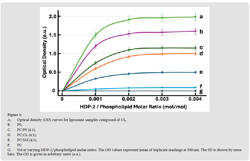 Table 1: Hydrolytic activity of HDP-2 in liposome samples composed of PC + 20 mol% SM, PC + 20 mol% CL, or PC + 20 mol% PS, presented in arbitrary units (a.u.) based on optical density measurements at 550 nm.
