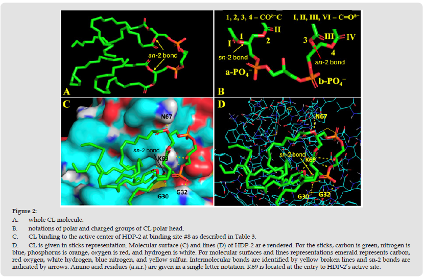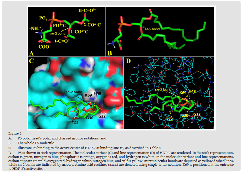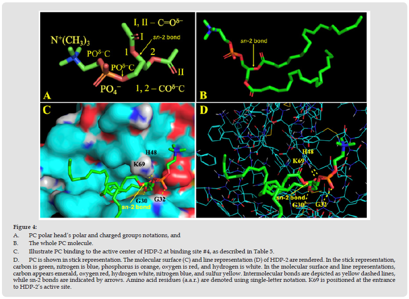 These tables report the binding site number, binding affinity, specific polar and charged groups participating in intermolecular bonds, and the types of bonds formed. The accompanying figures (Figures 2-5) display only those HDP-2 residues that form hydrogen, polar-ionic, and ionic bonds with the phospholipids. Notably, in the CL-HDP-2 docking pair (Table 3), Asn67 participates in binding despite being outside the active center. Similarly, Tyr22 contributes to binding in both PS-HDP-2 (Table 4) and SM-HDP-2 (Table 6) pairs, although it is not part of the enzyme’s active center. These observations suggest that regions beyond the canonical active site may influence phospholipid binding and orientation. Figure 2 illustrates two alkyl chains of cardiolipin (CL) positioned within the active center of HDP-2, with the sn-2 bond located in the active center. This observation supports experimental findings regarding the HDP-2’s hydrolytic activity in the CL containing liposomes. Figure 3 illustrates the ammonium group of the PS polar head making a polar-ionic bond with Tyr22 within the active center of HDP-2. This interaction facilitates the folding of the PS glycerol moiety, positioning the sn-2 bond deep within the active center of HDP-2. These findings align with experimental data demonstrating the hydrolytic activity of HDP-2 on liposomes containing PS. Figure 4 and Table 5 show that the phosphate group and polar groups of the PC glycerol moiety stabilize the sn-2 bond within the active site of HDP-2.