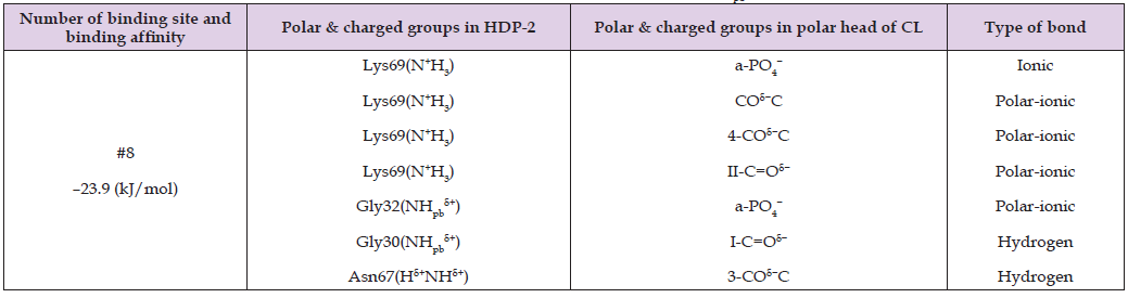 Table 3: Binding site affinity energy and types of intermolecular bonds between the polar and charged moieties of HDP-2’s amino acid residues and the polar and charged groups of the cardiolipin (CL) polar head, as predicted by AutoDock program simulations. The notations for the polar and charged groups in the CL polar head are provided in Figure 2B. In the notation NHpb δ+, Pb denotes a peptide bond.