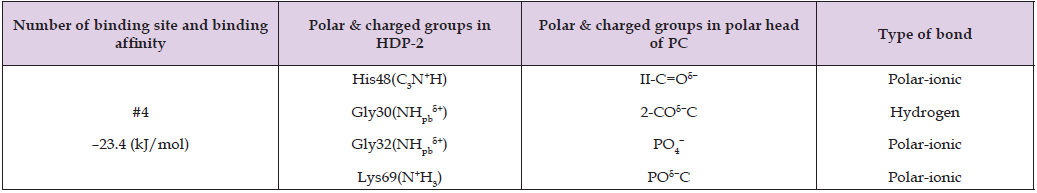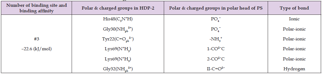 Table 4: Binding site affinity energy and intermolecular bond types between the HDP-2’s polar and charged groups of amino acid residues and the PS polar head’s polar and charged groups, as predicted by AutoDock simulations. The notations for the PS polar head’s polar and charged groups are provided in Figure 3A. In the notations NHpb δ+, pb denotes a peptide bond.
