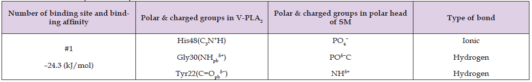 Table 6: Binding site affinity energy and intermolecular bond types between polar and charged groups of HDP-2’s amino acid residues and polar and charged groups of SM polar head predicted by AutoDock program simulation. Polar and charged groups notations for SM are given in Figure 5B. Pb in NHpb δ+ and C=Opb δ− denotes a peptide bond.