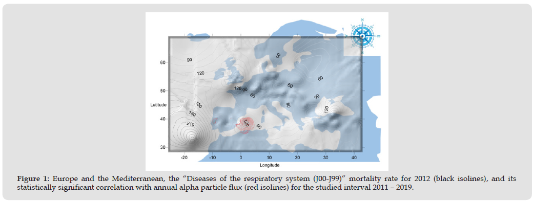 The correlation coefficients (Lakin [5]) between the annual averaged alpha radiation flux and the annual mortality rate were calculated. Maps were created showing the distribution of the annual mortality for 353 NUTS-2 European regions from the EUROSTAT shortlist death causes: “Diseases of the respiratory system (J00-J99)” (EUROSTAT mortality shortlist number 53), “Other diseases of the respiratory system (remainder of J00-J99)” (EUROSTAT mortality shortlist number 59), “Chronic lower respiratory diseases” (EUROSTAT mortality shortlist number 56), “Malignant neoplasm of lip, oral cavity, pharynx” (EUROSTAT mortality shortlist number 10), “Malignant neoplasm of larynx” (EUROSTAT mortality shortlist number 16), “Malignant neoplasm of trachea, bronchus and lung” (EUROSTAT mortality shortlist number 17), “Pneumonia” (EUROSTAT mortality shortlist number 55), and “Asthma and status asthmaticus” (EUROSTAT mortality shortlist number 57). With black isolines in the maps, the mortality rate for the year 2012, with the highest solar activity (and mortality), is shown in the studied time interval 2011 – 2019. With red isolines, the maps display the distribution across Europe and the Mediterranean of the correlation coefficient between the annual mortality rates of the diseases and the annually averaged alpha particle flux for the period 2011–2019. Data on the coordinates – latitude and longitude (using Google Earth) - of the centroids of the NUTS-2 regions included in the study were used to create the maps.