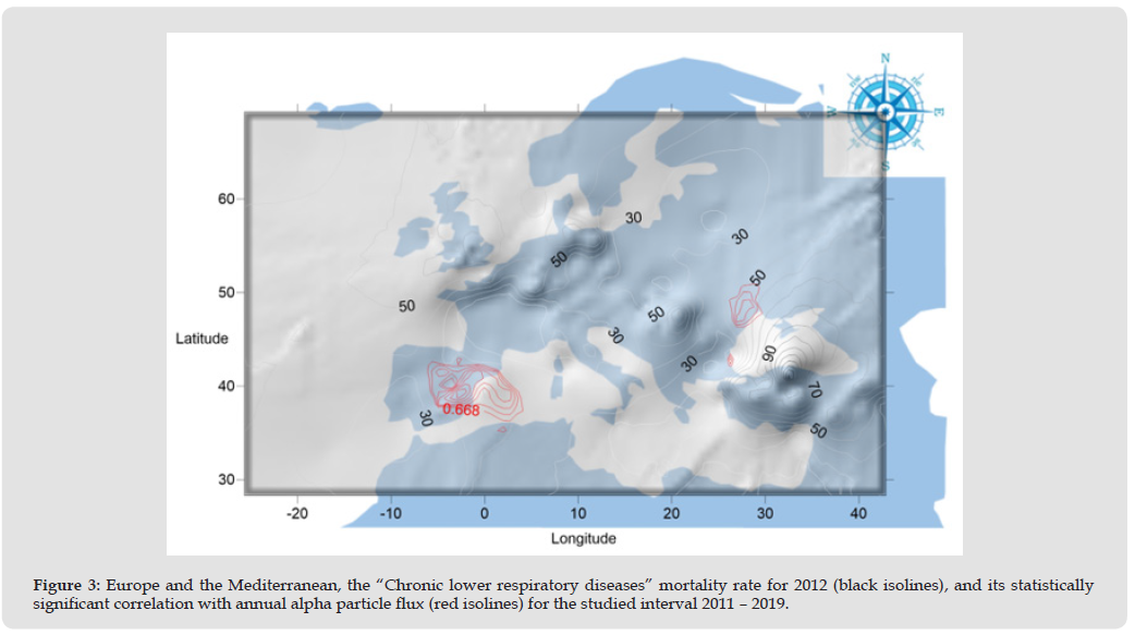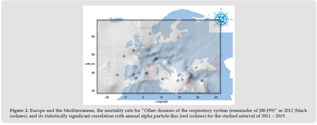 The described dangerous phenomenon is observed in the form of dependence between the annual average flux of radiation from positively charged particles (protons and alpha particles) with high kinetic energy, recorded by satellites in orbit around the Earth, and the annual mortality rate in the statistics of several countries from all continents in the Northern Hemisphere. The countries in whose mortality statistics the phenomenon is observed are located in a band parallel to the equator with approximate boundaries along the parallels of 30° and 50° north latitudes. It is observed in the annual mortality statistics of small countries. It is not noticeable in the statistics of large countries in the same band. It can be inferred that the impact on the Earth’s surface is short-lived and limited to a small area, comparable to the size of a small country, but is masked in large country statistics because it does not affect the entire area of the large country simultaneously. This conclusion is confirmed for the USA, for which data on mortality in individual states are available (Takuchev N [9]). The mortality statistics of the European Union are suitable for the study because they are based on statistical regions, which are smaller than a country but still large enough to include a statistically sufficient number of inhabitants. This phenomenon is also expected to influence mortality in countries south of the equator. However, their mortality statistics are scarce, unreliable, or absent, which prevents reliable inferences about the influence in the Southern Hemisphere. For particle energies ranging from 3.8 to 21.3 MeV, the year-averaged fluxes of protons and alpha particles are highly correlated, indicating that the studied phenomenon of lethality is noticeable in both the mean proton flux and the mean alpha particle flux data. For the reason explained below, only the average flux of high-energy alpha particles is included as the incident radiation in the following examples. With black isolines, Figures 1-8 show respectively the distribution of the mortality rate for the EUROSTAT shortlist death causes „Diseases of the respiratory system (J00-J99)”, “Other diseases of the respiratory system (remainder of J00-J99)”, “Chronic lower respiratory diseases”, “Malignant neoplasm of lip, oral cavity, pharynx”, “Malignant neoplasm of larynx”, “Malignant neoplasm of trachea, bronchus and lung”, “Pneumonia”, and “Asthma and status asthmaticus” for Europe and the Mediterranean, for 2012 the year of maximum solar activity (and mortality), from the studied interval. The distribution of the statistically significant correlation coefficient between solar alpha particle fluxes and the mortality rate is shown with red isolines in the figures.